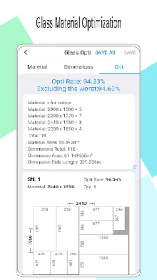 3. Sheet Cutting Optimization: Compared with glass cutting optimization , it adds the ability to set the kerf thickness yourself. This function is suitable for wood board cutting optimization , aluminum alloy plate cutting optimization , stainless steel plate cutting optimization , etc.