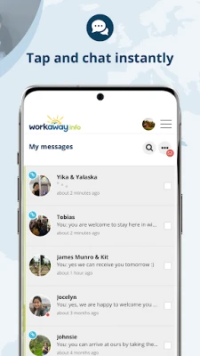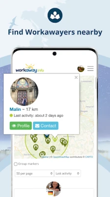 * Find workawayers in your area on a map, or search by dates for workawayers coming to your location